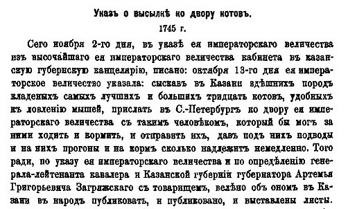 - Листки из записной книжки «Русской старины»: Указы императрицы Елизаветы Петровны // Указ о высылке ко двору котов (1745) / сообщ. А. Г. Пупарев. — Русская старина: ежемес. историч. изд. — СПб.: Печатня В. Головина, 1871. — Т. 3. — Вып. 6. — С. 642—643. То же: Именные указы императрицы Елисаветы Петровны = [Из бумаг М. Д. Хмырова] // Исторический вестник. — М., 1880. — № 2.