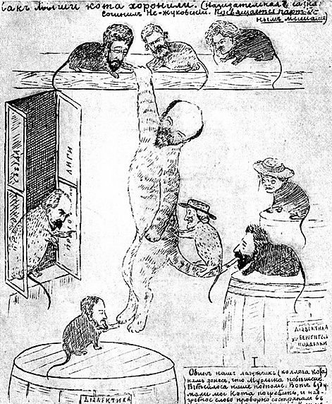 Следующие рисунки рассказывают, как Ленин взялся за расправу с меньшевистскими мышами и тем пришлось туго: бойкий мышонок Троцкий, который откалывал канкан, воротился домой без хвоста; Дан вместе с Мартовым достались Мурлыке на завтрак. А «премудрая крыса Онуфрий» — Плеханов, защемив хвост между дверьми, повис над бочонком с диалектикой, где обычно находил себе приют, как только ему приходилось круто. И кончился пир их бедою!..[42]