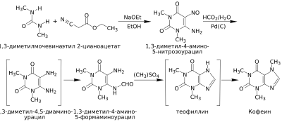 Ранее кофеин извлекали из отходов производства чая и кофейных зёрен. В настоящее время он производится синтетически[5]. В промышленности кофеин синтезируют из мочевой кислоты и ксантина.