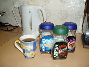 Содержание кофеина в кофе — 380—650 мг/л, в растворимом кофе — 310—480 мг/л, в кофе «Эспрессо» — 1700—2250 мг/л. В напитке «Кола» около 150 мг/л кофеина[16][17]. Содержание кофеина в чае варьируется в достаточно широком диапазоне — до 5—6 раз в сухом листе — в зависимости от разновидности и возраста чайного куста, времени сбора, продолжительности ферментации и других факторов[18]. В заваренном чае содержание кофеина в существенной мере зависит от способа заваривания (продолжительность, температура воды) и также может отличаться в несколько раз[18]. В большинстве случаев содержание кофеина в заваренном чае находится в пределах 180—420 мг/л[19]. Продукты «без кофеина» всё равно его содержат, но в уменьшенном количестве. Так, например, чёрный декофеинизированный чай обычно содержит от 8 до 42 мг кофеина на 1 л напитка. В процессе декофеинезирования из кофе обычно удаляется от 94 % до 98 % кофеина[20].