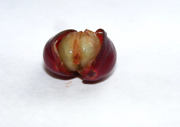 Плоды — ягоды с 1—3 семенами внутри; созревают 3—4 месяца, в зрелом состоянии представляют собой ярко-красные или бордовые (выведены сорта и с другими окрасками) эллипсоиды, сидящие на короткой плодоножке прямо на ветке. Под мякотью расположены семена, имеющие до обработки желтовато-зеленовато-серую окраску.
