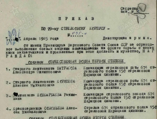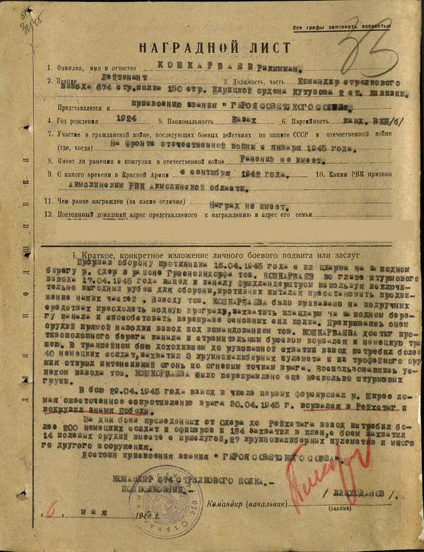 Приказом ВС 3-й ударной армии №: 121/н от: 18.06.1945 года командир стрелкового взвода 674-го стрелкового полка 150-й стрелковой дивизии лейтенант Рахимжан Кошкарбаев награжден орденом Красного Знамени за бои в Берлине и в рейхстаге, в ходе которых его взвод уничтожил более 200 солдат и офицеров противника, захватил в плен 184 солдата, 14 полевых орудий с прислугой, 27 крупнокалиберных пулемета.[14]