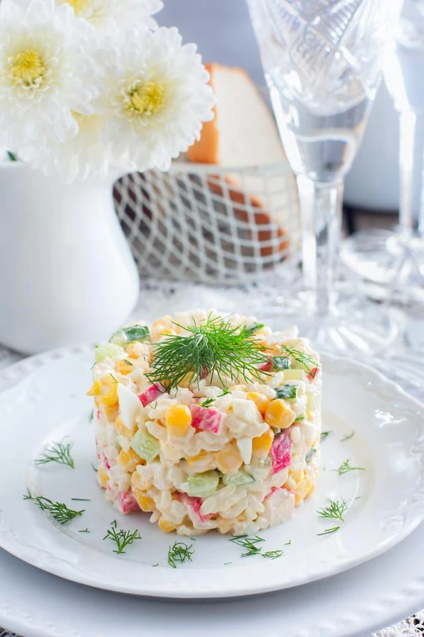 - Салат «Оливье» и салат «Весенний» — крабовый салат является логическим продолжением традиции популярных советских майонезных салатов, наследуя от них общий формат.