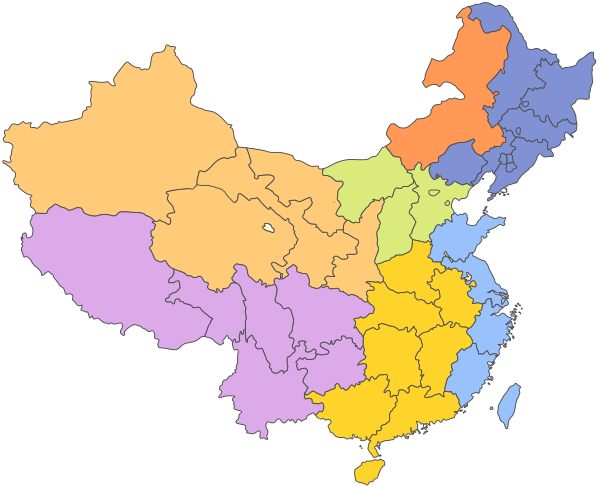 - Восточный Китай: провинции Аньхой, Тайвань (формально), Фуцзянь, Цзянсу, Чжэцзян, Шаньдун. Города Нанкин, Шанхай