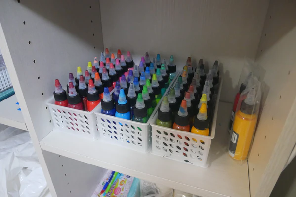 Краска состоит из пигментов в сочетании с носителем. Краски для тату доступны в различных цветах, которые можно разбавлять или смешивать для получения других цветов и оттенков. Большинство профессиональных татуировщиков покупают готовые чернила (известные как предварительно диспергированные чернила), в то время как некоторые татуировщики смешивают свои собственные, используя сухой пигмент и носитель.[1]