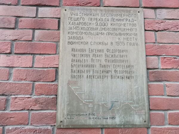 - 1 мая 1935 года комсомольцы-призывники завода начали пеший переход по маршруту Ленинград — Хабаровск на место прохождения воинской службы и завершили его 30 октября 1935 года. Это событие трудящиеся ЛНПО «Красная Заря» отметили 1 мая 1985 года установкой памятной металлической доски на стене здания во дворе завода[38];