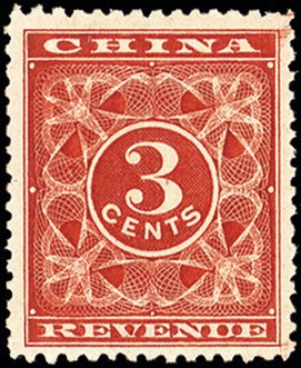 В январе 1896 года цензор Чень Би, чиновник правительства Цин обратился к императору Гуансюю с просьбой выпустить фискальные марки. Пробные оттиски были представлены на утверждение сэру Роберту Харту, генеральному инспектору таможни. Из заказанных в Англии фискальных марок только часть марок номиналом 3 цента была напечатана и отправлена в Китай. Они хранились в Шанхайском таможенном управлении. «Красные гербовые марки» номиналом 3 цента были напечатаны компанией Waterlow & Sons в Лондоне. Красный цвет символизирует удачу и счастье в китайских традициях.[1][2]