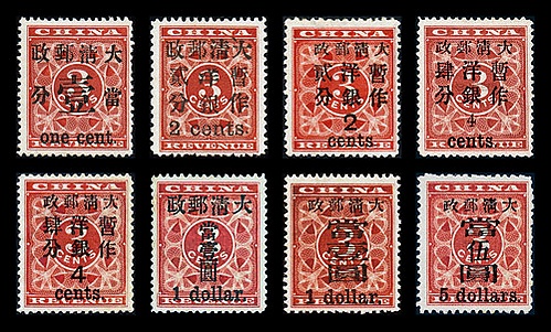 20 марта 1896 года правительство Цин одобрило план создания национальной почтовой службы под контролем Таможенного управления.[5] При открытии почтовой службы в феврале 1897 года заказанные из Японии почтовые марки «Извивающийся дракон» не были доставлены вовремя, поэтому, чтобы удовлетворить спрос, на лежащих без дела красных фискальных марках номиналом 3 цента была сделана надпечатка. Известны надпечатки пяти номиналов: 1 ц, 2 ц, 4 ц, 1 доллар и 5 долларов.[1][2]