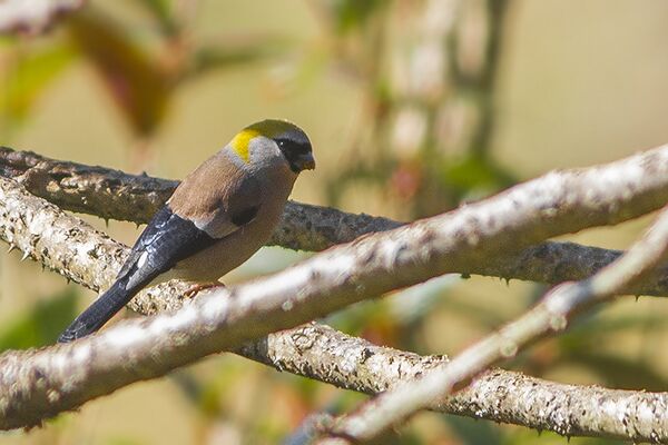 Птица мелких размеров, меньше воробья. Чёрные перья вокруг клюва формируют так называемую маску. Хвост, рулевые и большие кроющие крыла тоже черные. Полоса из больших верхних кроющих крыла - светло-серая или белая. Спина и кроющие крыла серые. Белые — перья вокруг маски, надхвостье и подхвостье. Крайнее внутреннее маховое с красным пятном. У самцов голова, грудь и живот красновато оранжевые. Сверху на голове и зашейке более насыщенного цвета. У самок те же участки перьев (верх головы и зашеек) окрашены в жёлтый, остальное - щеки, спина и живот серо-коричневые. Переход между спиной и жёлтой головой серый. Хвост ступенчатый, с выемкой по середине, но меньшей, чем у бурого.