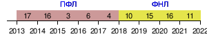 | 2017/18 | ▲ 4 из 17 | 32 | 16 | 9 | 6 | 58 — 37 | 54 | переход в ФНЛ | |