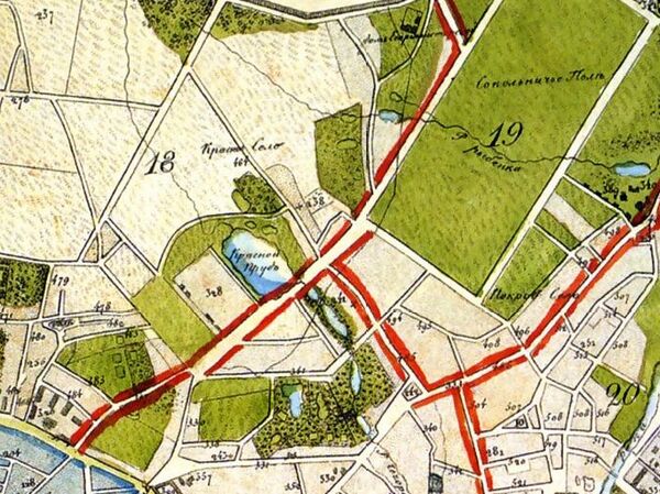 Согласно генеральному плану Москвы Н. Белоусова (1850—1851 года) на территории Красного села можно отметить значительный рост числа домовладений, преимущественно деревянной постройки. К западу от монастыря расположились усадьбы с парковыми зонами. Обширная территория земель бывшего села была занята садами и огородами[1].