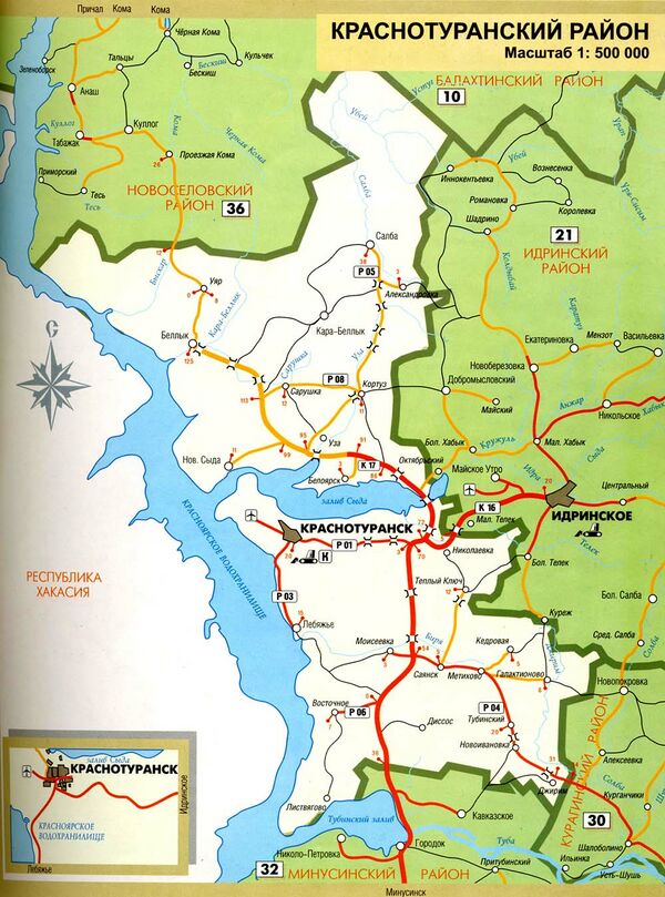 Центр Краснотуранского района — село Краснотуранск — расположено на берегу Сыдинского залива. Раньше оно называлось Абаканским и находилось на берегу реки Енисей. Село было крупным ремесленным центром и славилось ярмарками. В 1933 году его переименовали, взяв за основу название гор Туран и Красная, между которыми он располагался