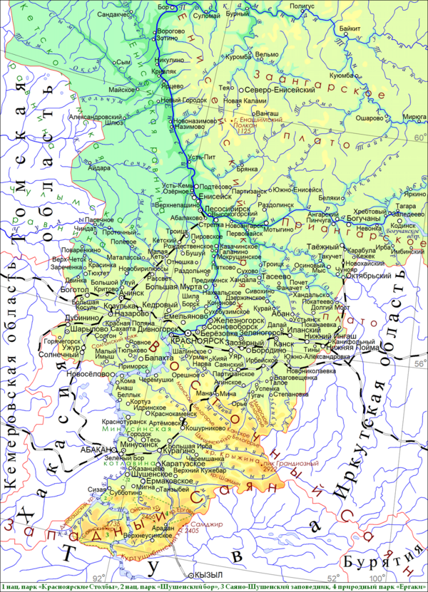 | Крупнейшие города | Красноярск, Норильск, Енисейск, Лесосибирск Железногорск, Зеленогорск, Ачинск, Канск, Минусинск | ||||