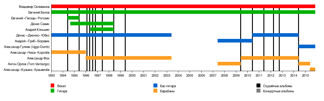 - Владимир Селиванов — вокал, голоса, гитара (с 1993 года по 02.11.2015)