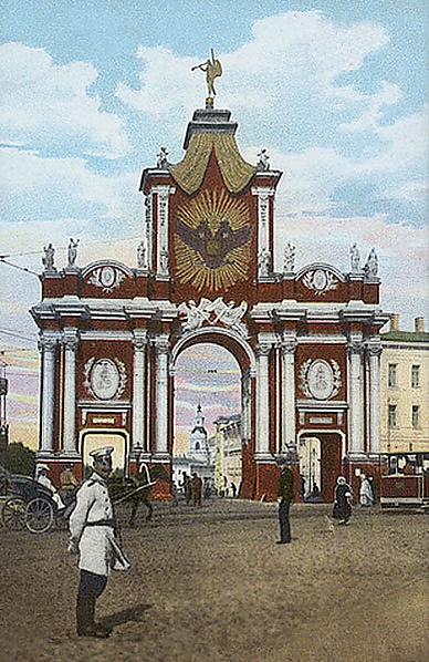 После победы в Полтавской битве в 1709 году Пётр I приказал построить деревянные триумфальные ворота для торжественной встречи возвращавшихся войск. Ворота на Мясницкой улице у Земляного города, ставшие первой в России триумфальной аркой, неоднократно горели и перестраивались. Так, к своей коронации в 1724 году Екатерина I распорядилась поставить на том же месте новые ворота[6]. В 1732-м постройка полностью сгорела и была восстановлена через десять лет к следующим коронационным торжествам. Кортеж императрицы Елизаветы Петровны во время церемониального проезда должен был проследовать из Кремля в Лефортовский дворец через триумфальную арку[2][1][7].