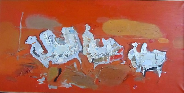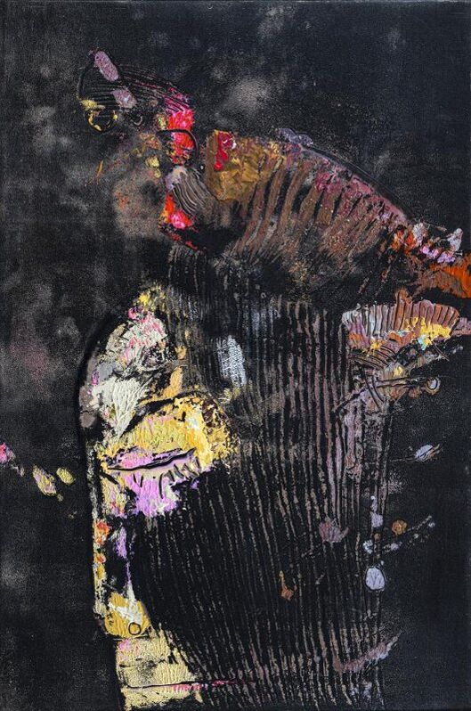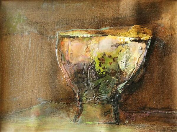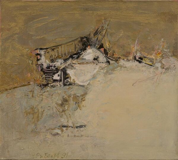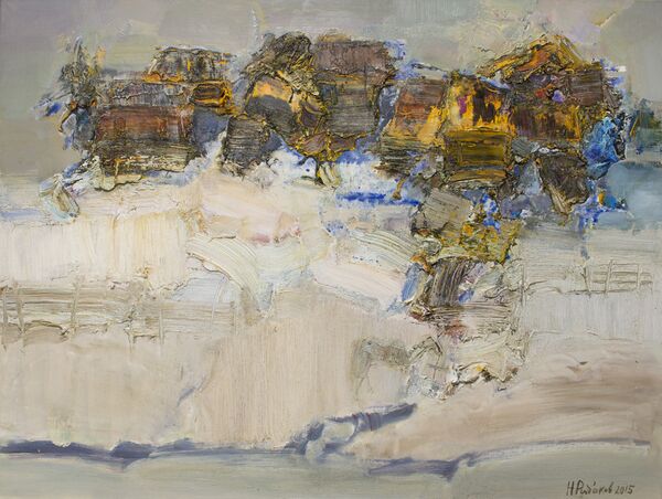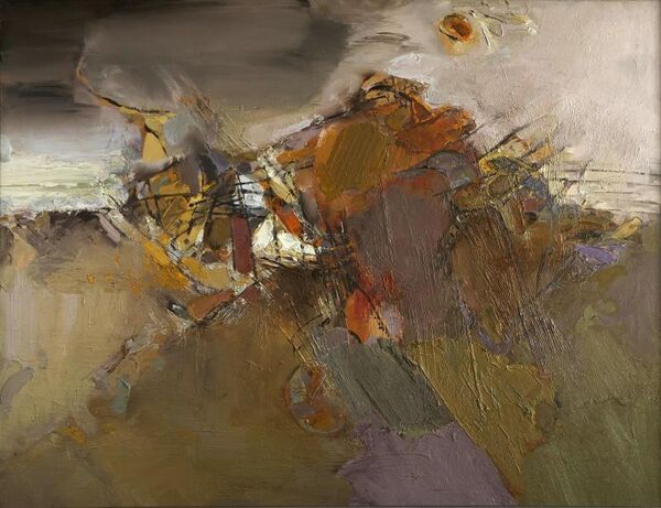 Работа представляет собой пример абстрактной живописи, в центре которой сосредоточены массивные объёмы различной формы, цвета и величины. В верхней части композиции преобладают светлые тона, а справа вверху выделяется плотное пятно округлой формы, служащее визуальным акцентом.