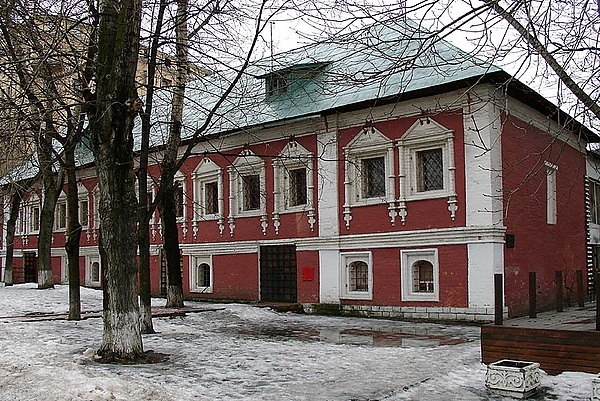 Красные палаты являлись главным домом городской усадьбы боярина Бориса Гавриловича Юшкова, построенной между улицами Остоженка и Пречистенка в 1680-х годах. Фасад был обращён на Чертольские ворота Белого города[7]. В единый ансамбль с Красными также входили Белые палаты, благодаря расположению на возвышенности и выразительному декору оба здания были архитектурной доминантой местности. Внутренняя планировка Красных палат была выдержана в соответствии с традициями древнерусского зодчества: подклет отводился под хозяйственные помещения, а второй и третий этажи — для жилых комнат и парадных залов, к ним вело отдельное нарядное крыльцо с северной стороны. Внешнее оформление обнаруживает элементы нарышкинского барокко: белые рельефные наличники арочных окон контрастируют с красным кирпичом стен[8][9].