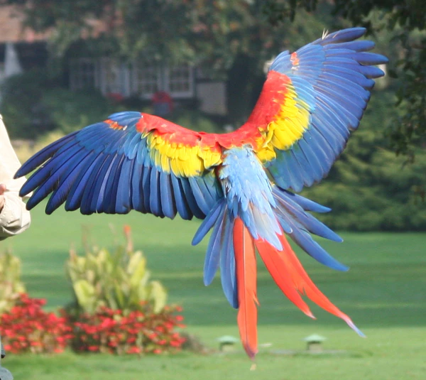 Голова, верх крыльев, шея, верх спинки, грудка и живот ярко-красные, надхвостье и низ крыльев ярко-синие, поперек крыльев проходит жёлтая полоса. Голые щёки светлые с рядами белых пёрышек. Надклювье белое с коричнево-чёрным пятном у основания клюва и чёрным кончиком, подклювье буровато-чёрное. Радужка жёлтая. У самки клюв меньше и шире в основании, а верхняя его половина имеет более крутой изгиб.