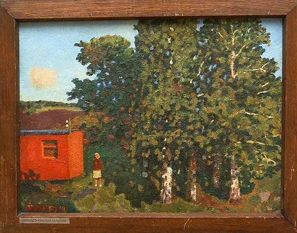 В центре композиции на фоне зелёной лужайки слева изображён красный строительный вагончик, у которого стоит женская фигура. Справа располагается группа высоких берёз с сочной зелёной листвой. На дальнем плане видна зелёная полоса леса и ясное голубое небо.