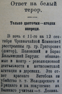 Только сегодня мы услыхали в ЦК, что в Питере рабочие хотели ответить на убийство Володарского массовым террором и что вы … удержали. Протестую решительно! Мы компрометируем себя: грозим даже в резолюциях Совдепа массовым террором, а когда до дела, тормозим революционную инициативу масс, вполне правильную. Это невозможно! Террористы будут считать нас тряпками. Время архивоенное. Надо поощрять энергию и массовидность террора против контрреволюционеров…