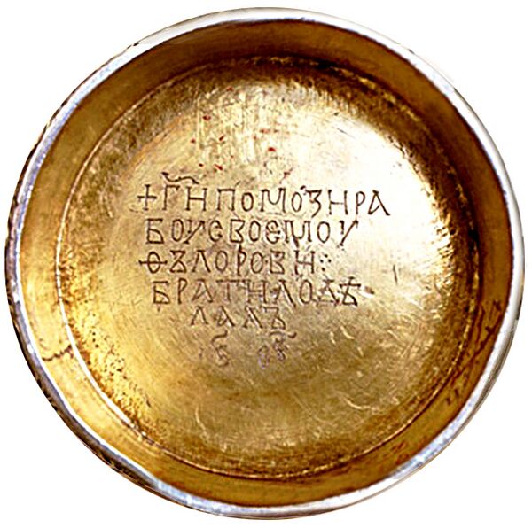 2. В решении проблемы идентификации заказчиков кратиров ученые основывались на вкладных надписях, из которых следует, что кратир Косты был заказан неким Петром и его женой Марьей, а сосуд Братилы – Петрилой и его женой Варварой. Как в Ромейской империи, так и в Древней Руси такие вклады до XII века мог делать только князь или лицо, заменяющее по своему общественному положению князя. Исходя из этого положения исследователи видели (в соответствии с представлением о датировки памятников) разных новгородских посадников. Чаще всего заказ Братиле чаши приписывают Петрилу Микульчичу, который мог вложить кратир скорее всего в годы своего посадничества (1131–1134). Заказчиком кратира Косты видят, по предположению И.А. Стерлиговой, Петряту – третьего новгородского посадника, деятельность которого проходила на рубеже столетий. А.А. Гиппиус предположил, что этот кратир был заказан боярином Прусской улицы Петром Михалковичем в Софийский собор по случаю торжества, которое проходило в стенах собора, а именно – венчания дочери боярина Анастасии и князя Мстислава Юрьевича.