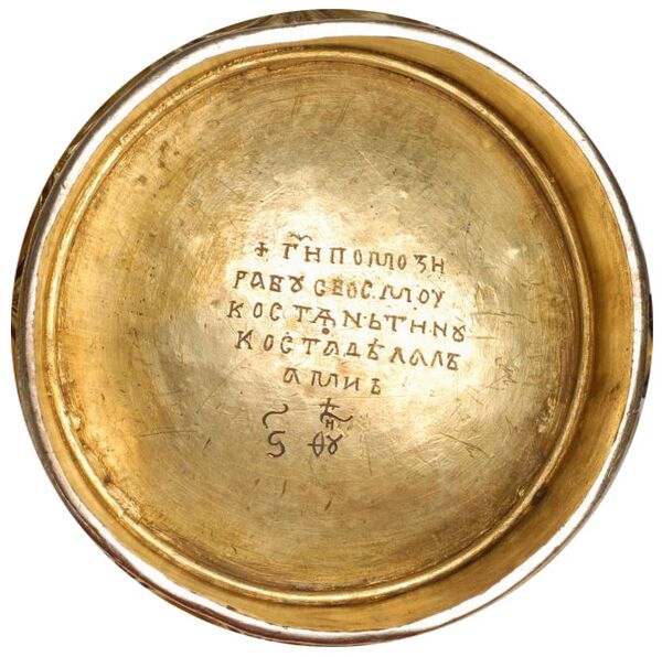 На гранях между изображениями – чеканные флористические узоры и пальметты. Две большие литые ручки, вертикально прикрепленные от венчика до самого низа тулова чаши, украшены крупными цветками и отростками с тройными шариками на концах, воспроизводящими в соответствии с символикой причастного сосуда виноградные гроздья. На широком венце нанесены крупные резные с чернью евхаристические надписи, таким же образом сделаны вкладные надписи на гладком поддоне чаши. Верх