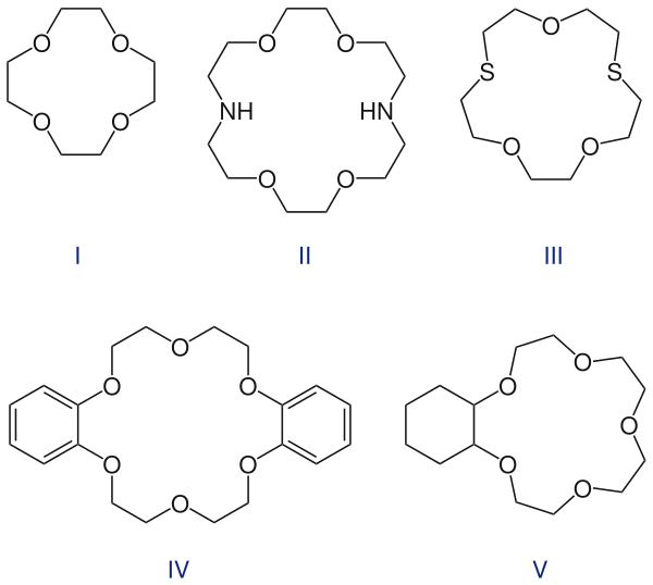 Как правило, гетероатомом является атом кислорода. Если один или несколько атомов кислорода заменены атомами азота или серы, то соответствующие соединения называются соответственно азакраун- или тиакраун-эфирами. Если краун-эфиры конденсированы с бензольными или циклогексановыми кольцами, то они относятся к бензокраун- или циклогексанкраун-эфирам. Получены краун-эфиры, содержащие в цикле атомы P, Si, As, а также амидные, сложноэфирные и некоторые другие функциональные группы.