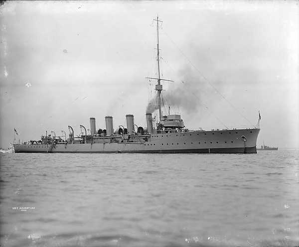 Наиболее оригинальный проект предложила компания Armstrong, знаменитая своими элсвикскими крейсерами. Скауты серии «Эдвенчур» (англ. Adventure) стали первыми британскими крейсерами с 1880 года, не имевшими тарана. Вместо этого корабли получили клипперский форштевень и небольшой бульб в подводной части, что предвосхитило будущий облик типичных британских крейсеров. Корпуса имели короткий полубак, а число дымовых труб достигло четырёх. «Эдвенчур» и его систершип имели в качестве силовой установки весьма совершенные паровые машины редко встречавшейся системы Маршала-Алена, что обеспечило им умеренные габариты по высоте, низкий уровень вибраций, но очень высокую надежность. На испытаниях крейсера смогли показать среднюю скорость 24,5 узла на восьмичасовом пробеге. Максимальная скорость достигла 26 узлов. Броневая защита оказалась традиционной и сводилась к броневой палубе со скосами[8]. «Эдвенчур» и «Эттентив» заложили в июне — июле 1904 года, а в строй ввели в октябре 1905 года[2]. Их средняя стоимость составила 270 000 фунтов стерлингов за единицу[9].