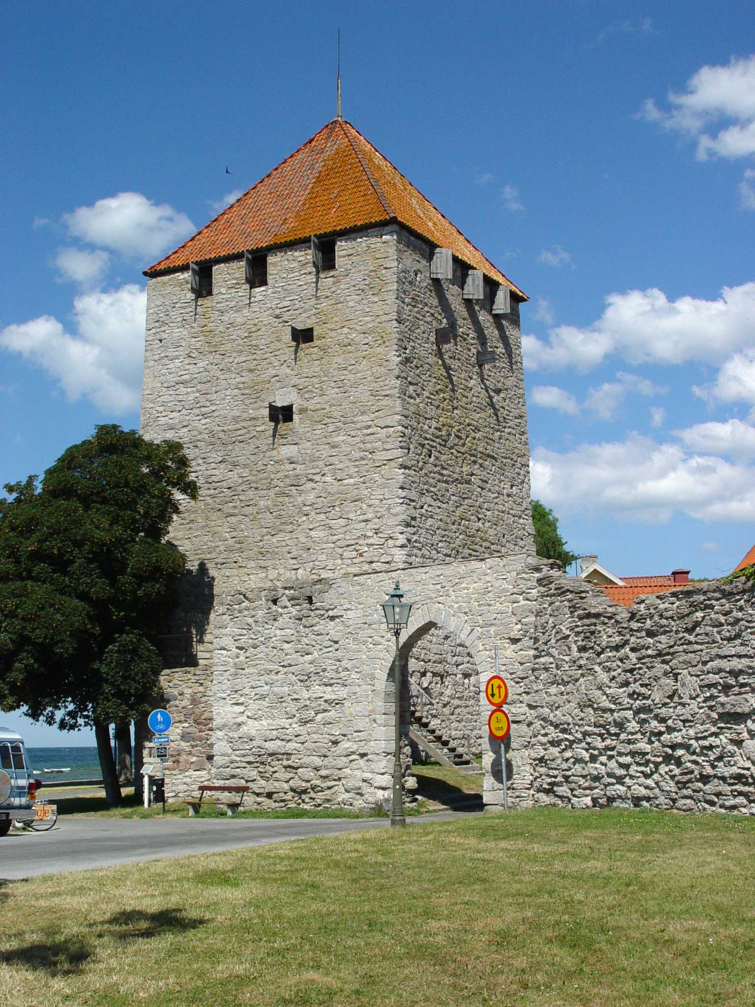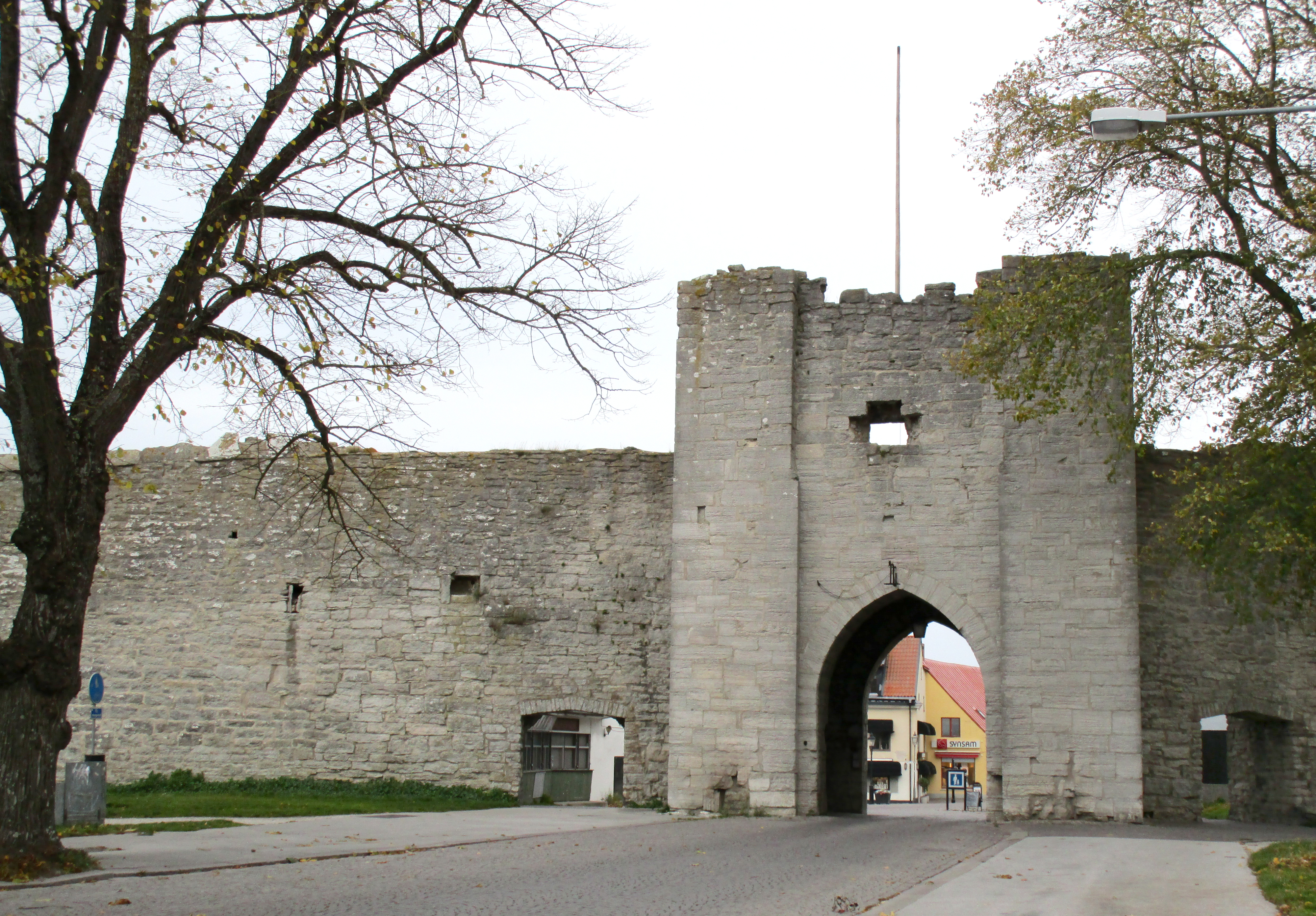 | Северные ворота | Norderport | Norderport — одна из старейших башен, служила главным входом в город для людей и товаров из северной части острова[1]. Первоначально в стене были лишь простые ворота. Всё ещё виден слот для таможенного барьера, обрамлённый деревом. Проём ворот был, вероятно, перестроен вместе с постройкой башни. Norderport и Österport — старейшие башни стены и были построены вскоре после возведение первой стены в 1280 году. Norderport стоит на крутом склоне. Ворота построены надёжно и обладали отличным оборонным потенциалом. Внешние деревянные ворота усилены герсой. Отверстия для цепей и верёвок для поднятия решётки всё ещё существуют. Через другие отверстия могли выливать воду на случай, если нападающие попытаются поджечь ворота[32][18]. На внешних опорах стены прикреплены железные кольца. Скорее всего, они использовались для закрепления цепи, что могла быть натянута через весь проход. В мирные времена ворота были обычно открыты, а проход преграждала лишь цепь. В помещениях над воротами располагались очаги, что показывает, что ворота постоянно охранялись целую зиму. На нескольких этажах бойницы были расширены в 1710 году для размещения пушек. На вершине башни видны следы внешней галереи для лучников. В XVII веке пожар уничтожил все деревянные части от Norderport до Silverhättan[33]. В настоящее время ворота используются в том числе для проезда автомобилей[23]. | ||