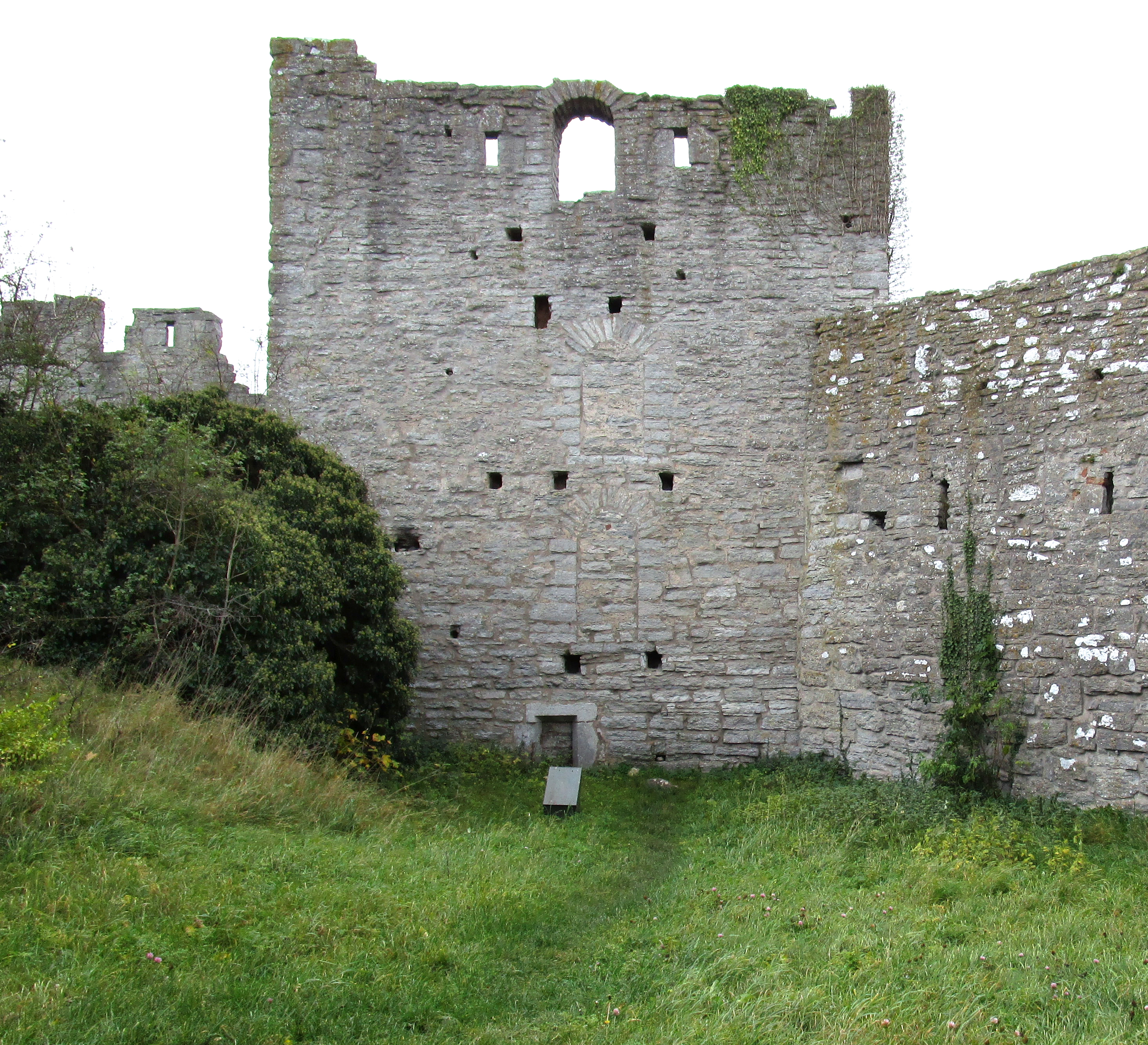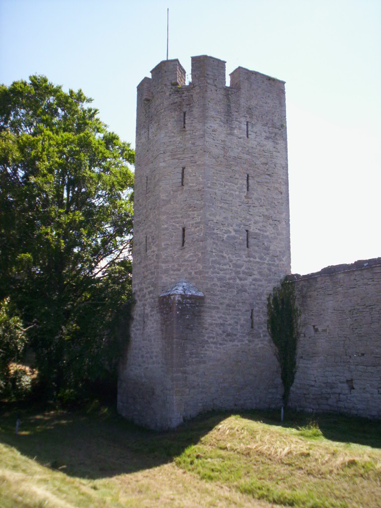 | Замковая стена | Slottsmuren | Slottsmuren. Расположена на юго-западном углу стены и ранее была башней под названием Segeltornet («Парусная башня»). Остатки фундамента показывают, что эта башня была крепче, чем остальные башни на южной части стены[62]. Как и у Kruttornet, стена Segeltornet, обращённая к городу, была глухой. Боковая стена шла от башни вниз по склону по направлению к морю, что препятствовало проходу по внешней стороне стены по направлению к морю. Рядом с остатками башни расположены части той стены и ворота в более ранней стене[63]. Эти ворота также служили проходом между внутренним двором замка Висборг и внешними оборонительными сооружениями[64]. | ||