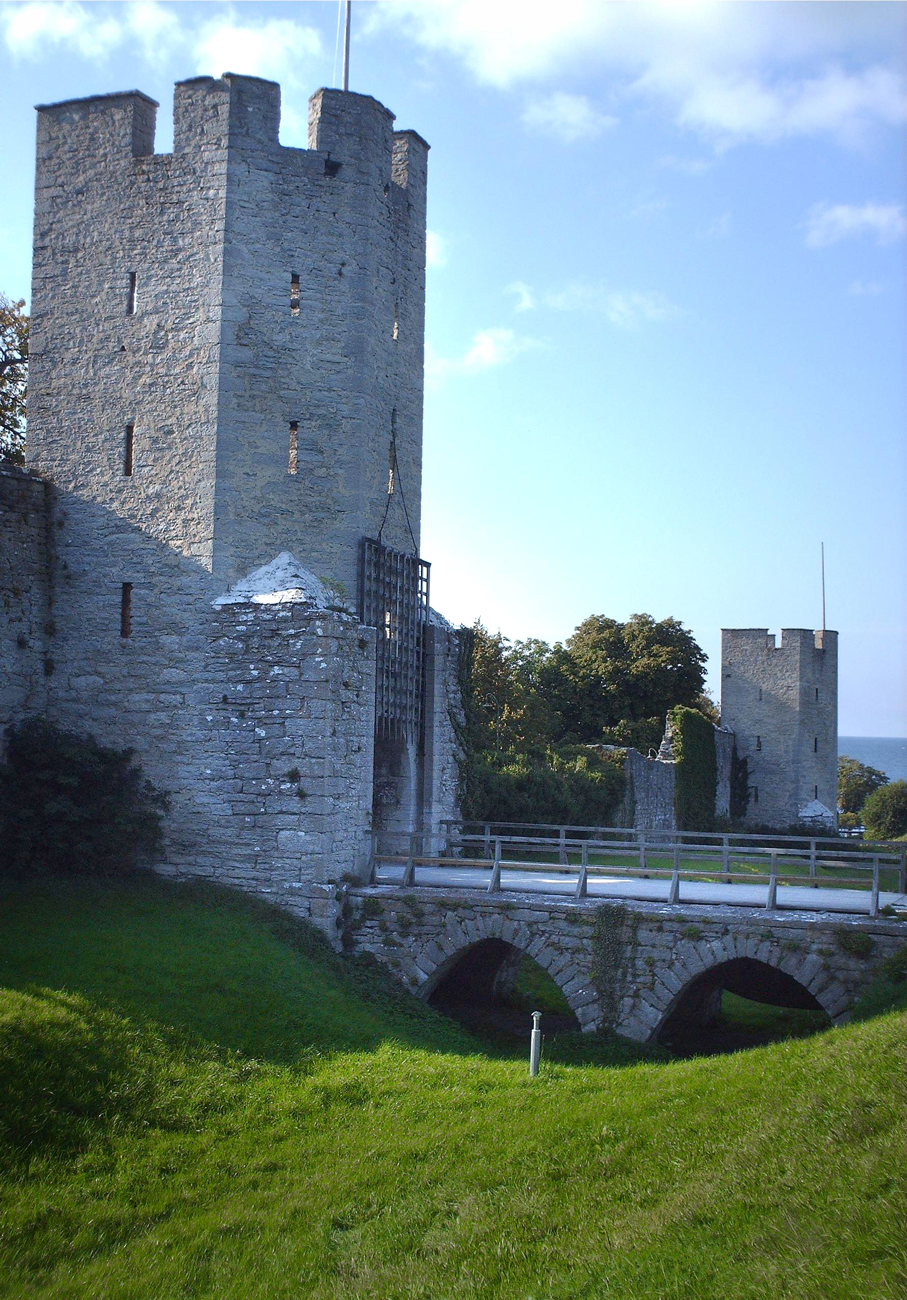 | Ворота Святого Георга | Sankt Göransporten | Sankt Göransporten. Дорога из этих ворот ведёт от центра города к ныне разрушенным богадельне и церкви Святого Георга[30]. Снаружи башни лежит мост через Nordergravar («Северные рвы»), часть средневековой оборонительной системы[1]. В старых документах ворота называются Andre Lång Henrik («Почти высочайший Генри»), что могло быть средневековым названием. В XIX веке ворота были известны как Ödeporten («Заброшенные ворота»), а в начале XX в. стало использоваться текущее имя. Постройка ворот может быть связана с постройкой ранее упомянутых богадельни и церкви, которые являлись средневековым лепрозорием. В середине XVIII века ворота были заблокированы, возможно в связи с установкой очага для варки дёгтя для изготовления верёвок. Башня подвергалась атаке с помощью осадной машины, свидетельством чему служит камень от катапульты, застрявший в одной из бойниц на четвёртом этаже. Мост через ров был перестроен в 1901 году. По обеим сторонам от ворот видны следы обрушившихся башен[31]. | ||