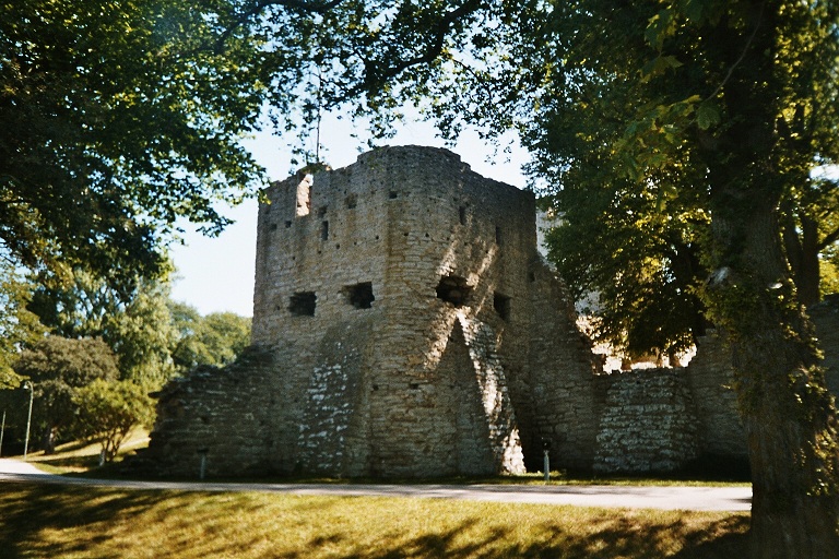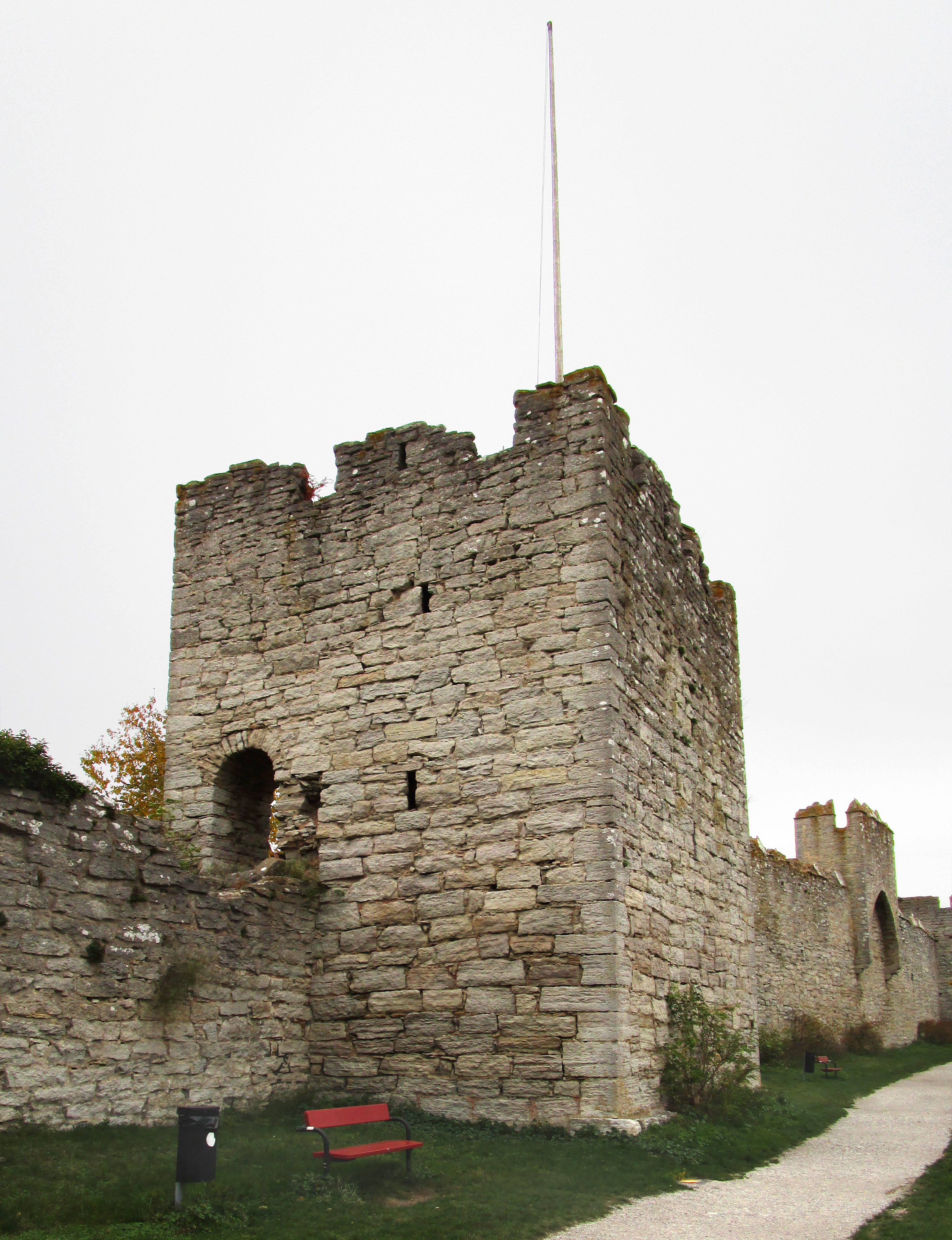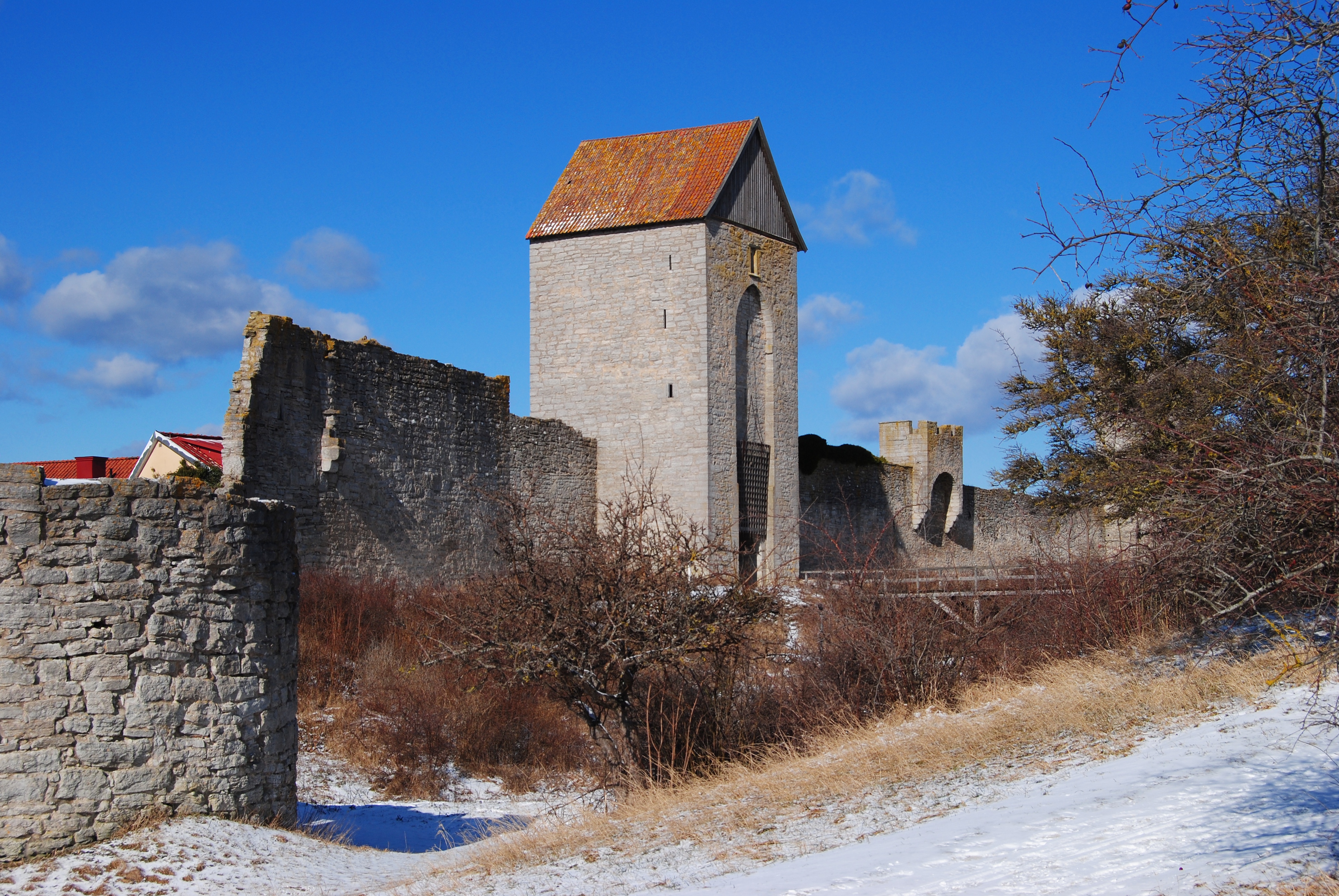 Kruttornet — старейшая башня, защищавшая гавань, на месте которой в настоящее время находится парк Альмедален. Была построена в 1160-61 гг. как свободно стоящая защитная башня, в связи с торговым соглашением с герцогом Саксонии. Изначально существовала аналогичная башня на противоположной стороне гавани, её остатки были найдены в подвале одного из жилых домов[2]. Сама гавань также исчезла из-за пост-ледникового поднятия земли. С вершины башни можно было вести стрельбу прямо по прибывающим кораблям. У башни отсутствовали ворота, доступ в башню осуществлялся с помощью приставной лестницы через небольшой люк в стене на уровне 10 м над землёй. Такой дизайн затруднял атакующим доступ к башне[18]. Название «Пороховая башня», было дано в значительно более поздний период. Во время войны с Данией в 1361 г. и с перерывами между 1394 и 1487 гг., башня служила обеим сторонам складом для пороха, так как представителям Висбю было обыденно менять поддерживаемые стороны[9]. | ||