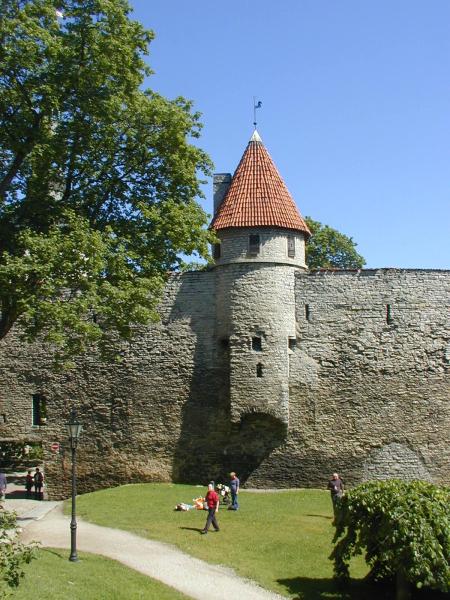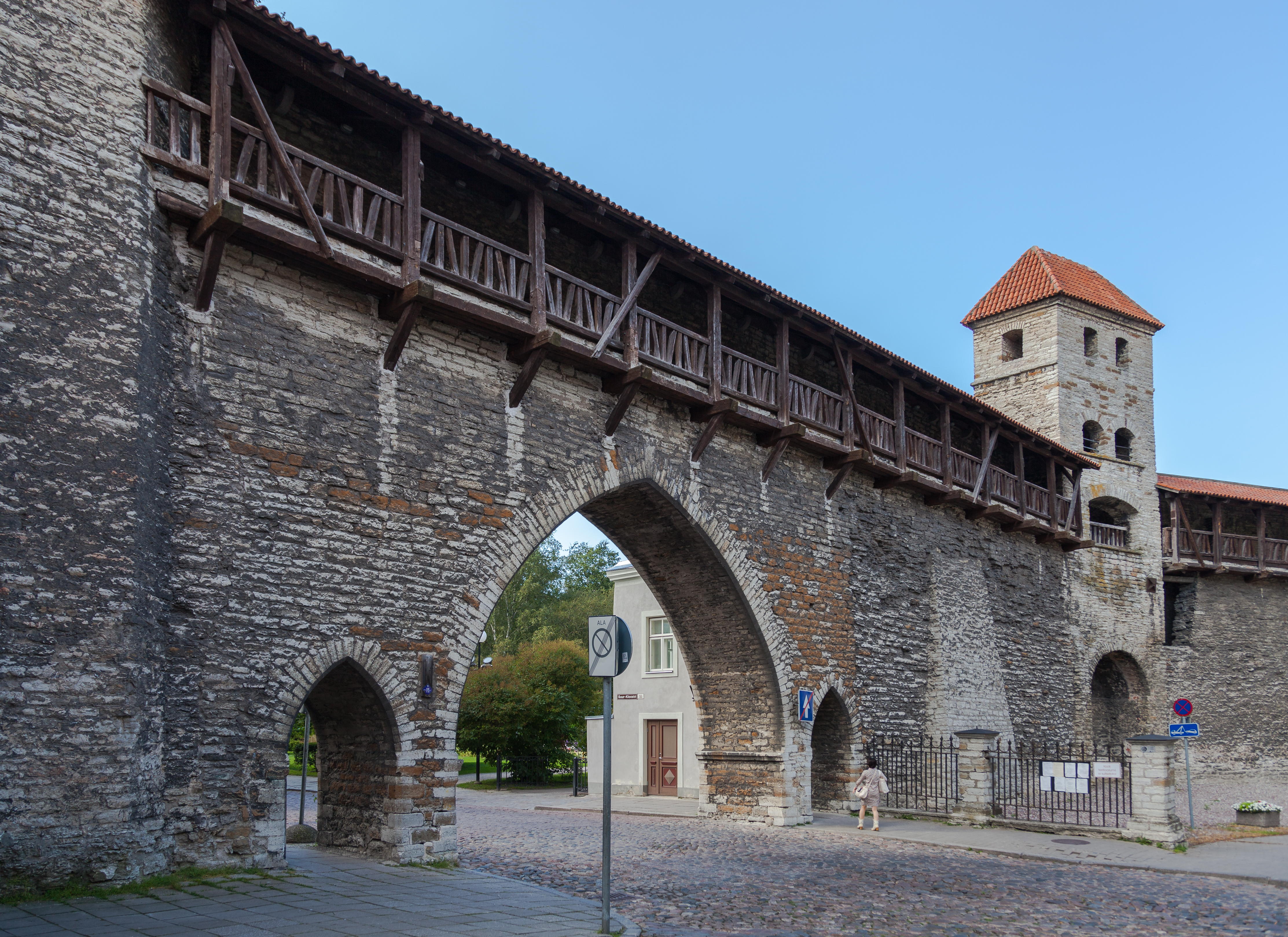 Крепостные стены города известны с 1248 года, считается, что первые укрепления проходили по современным улицам Лай, Хобусепеа, Вана Тург, Кулласепа. Древнейшие из сохранившихся по сей день стен и башен относятся к XIV веку, их строительство началось в 1310 году под руководством датчанина Иоханнеса Канне, к этому времени территория города была уже существенно расширена. Предположительно, к 1355 году окружение городской территории стенами было завершено, в периметре стен было возведено 11 башен, 6 из них имели ворота (Нунна, Большие и Малые Морские, Виру, Карья, Харью). Строительство продолжалось в XV веке, к 1413 году возведено 27 башен (все они тогда были прямоугольными, а свою нынешнюю форму приобрели в дальнейшем). Очередная реконструкция укреплений была завершена в 1520-х годах, они очень хорошо сохранились до сих пор. На конец XVI века были возведены 26 башен, из которых сохранилось 18. Стены имели высоту до 8 метров при толщине 2,85 метра. По низу внутренней части стены шла стрельчатая аркада. Строительным материалом для городских укреплений был местный серый слоистый известняк — плитняк[2].