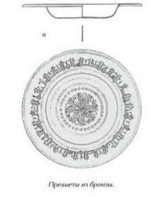 Коллекция изделий из бронзы и меди насчитывает 21 предмет: пуговица, пряжка, нашивки, украшения и утварь. Среди них обращает на себя внимание плоская тарелка высотой 2,6 см с широким отогнутым венчиком диаметром 22,9 см. Широкая горизонтальная площадка венчика орнаментирована арабской надписью. Она выполнена почерком «куфи» и содержит повторяющуюся семь раз фразу «Власть Аллаху», то есть отрицается какая бы, то ни было власть, кроме божественной.