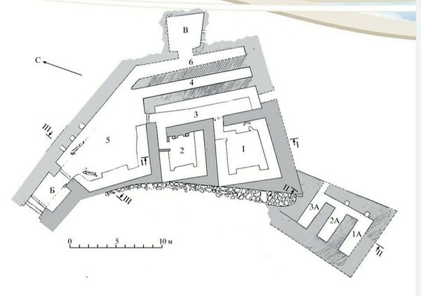 В плане он имеет форму треугольника со стороной около 25 м, вершины «треугольника» оформлены башнями (А, Б, В). Сохранились остатки ещё одной башни (Г), вынесенной на 20 м к востоку по одной линии с башнями Б и В. Функцию башни на южной вершине «треугольника» выполняло здание А — «донжон» (жилая башня). Сооружение в плане прямоугольной формы размером 11×8 м, сохранилось в высоту на 4 м, изначально было двухэтажным.