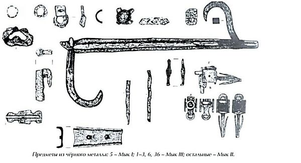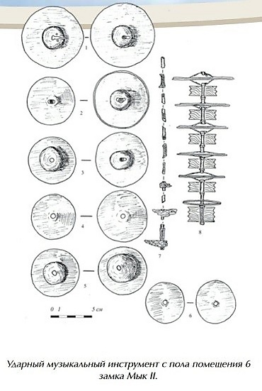 Работа достаточно уверенная, хота в одном месте добавлена лишняя буква, так как мастер при нанесении надписи не совсем точно рассчитал пространство. Подобные мыкской находке предметы с надписью — явление крайне редкое, тем более, когда они происходят из хорошо датированных комплексов. Интересен ударный музыкальный инструмент — цимбалы, состоящие из шести пар бронзовых или латунных дисков различного диаметра и, соответственно, звучания, нанизанных на коленчатый железный стержень с деревянными муфтами между каждой парой.