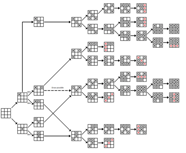 Для решения такого рода игр на компьютере строится дерево игровых ситуаций в соответствии с методом минимакс. Полное число узлов в таком дереве равно 255168[4]. Это число получается как сумма всех возможных вариантов ходов — 9 вариантов на первом шаге, 8 — для каждого из 9 на втором шаге, 7 — на каждом из 72 вариантов на третьем шаге и т. д., за вычетом ситуаций досрочного окончания игры (выигрыша).