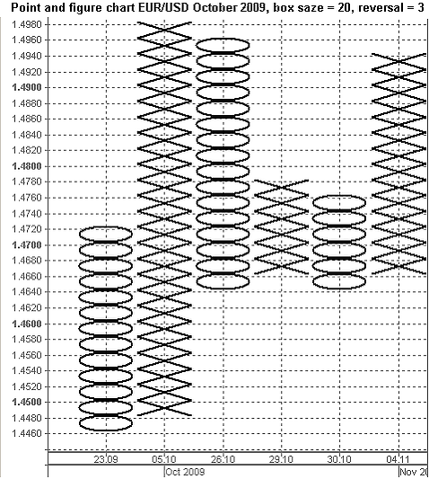 Пункто-цифровой график не привязан к шкале времени. Это требует существенного изменения многих подходов традиционного технического анализа. Графики этого типа автоматически демонстрируют тренд и особенно удобны для выделения уровней, вокруг которых цены колеблются длительное время (уровни консолидации цен).