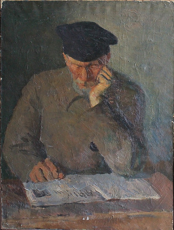 На полотне представлен пожилой мужчина с короткой седой бородой и усами, изображённый по пояс в положении en face, однако его взгляд опущен вниз. Он сидит за столом, на котором лежит газета; правая рука покоится на столе, а левая подпирает щеку, что придаёт образу задумчивость. Мужчина одет в коричневое пальто и чёрную шапку. Фон выполнен в нейтральных сероватых тонах, что подчёркивает фигуру персонажа и акцентирует внимание на деталях портрета.