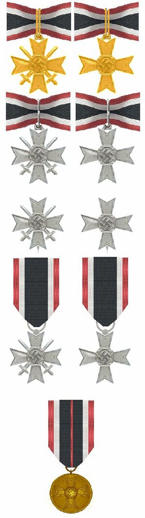 Медаль Креста военных заслуг была введена исключительно для награждения гражданских лиц, и изначально изготавливалась из бронзы, но в ходе войны качество материала ухудшалось, и последние награды имели только бронзовое покрытие. За время существования медалью награждено более 4 миллионов человек. Крест военных заслуг второй степени без мечей был предназначен для награждения лиц, оказавших содействие военным, но непосредственно не принимавших участия в военных действиях. Этим критериям соответствовали гражданские лица, перевыполнявшие план на фабриках и заводах, служащие охраны и полиции. Крест военных заслуг 2-й степени с мечами предназначался для военнослужащих, в основном это был вспомогательный персонал и персонал обеспечения, совершивший мужественный или другой значимый поступок, требующий поощрения, но не в непосредственном столкновении с врагом. Награда первоначально изготавливалась из бронзы, но в ходе войны качество материала ухудшалось, и поздние версии награды выполнены преимущественно из цинка с бронзовым покрытием.