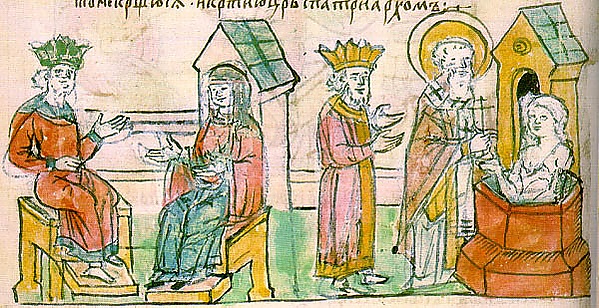 В византийском церковно-государственном правосознании император (басилевс) мыслился как хранитель и верховный защитник Церкви (эпистимонарх), а следовательно, и единый самодержец (автократор) всех православных народов. Правители прочих христианских народов (государств) получали от него титулы архонтов, князей, стольников. Таким образом, приняв крещение от ромеев (византийцев), Владимир включил Русь в орбиту византийской государственности[52][53].