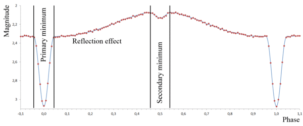 Область, обозначенная на рисунке Primary minimum, соответствует главному минимуму блеска: яркий белый карлик находится в затмении, наблюдатель видит лишь тусклый холодный спутник, поэтому суммарный блеск системы минимален. Повышение блеска по краям области соответствует частичному затмению белого карлика. По мере того, как при орбитальном обращении белый карлик выходит из-за спутника, наблюдатель видит всё увеличивающуюся долю его диска, и блеск системы возрастает. Фаза 0,5 соответствует положению, когда белый карлик и спутник меняются местами: белый карлик располагается перед спутником и проходит по его диску в процессе орбитального движения. При этом затмевается некоторая часть диска спутника, и на кривой блеска появляется вторичный минимум (обозначен на рисунке как Secondary minimum). Поскольку затмеваемая область спутника невелика и имеет низкую (по сравнению с белым карликом) температуру, то её блеск невелик; в результате вторичный минимум не так глубок, как главный минимум.