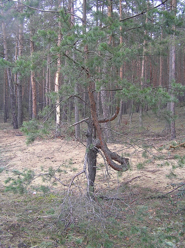 - саблевидность — плавное простое искривление ствола, встречающееся у ели и лиственницы. Саблевидные прямые вверху стволы (и кривая в комле сосна) использовались для изготовления полозьев и кокор;