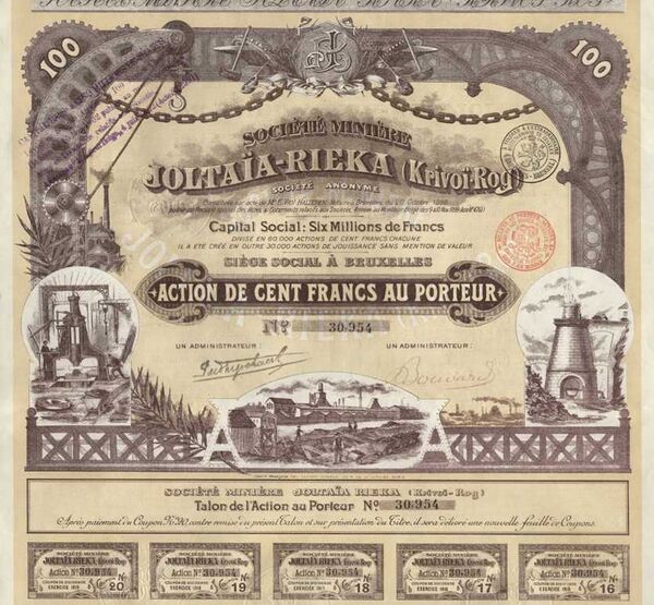 Владения английской компании «Новороссийское общество каменноугольного, железного и рельсового производства» основатель Джон Хьюз … Общество владеет в Кривом Роге около 1 500 дес. земли, с залежами железных руд, содержащих 58 % — 65 % железа. Добыча составляет в настоящее время 16 миллионов пуд. в год. … В недрах общества имеется запас руды около 1 ½ миллиарда пудов. …
