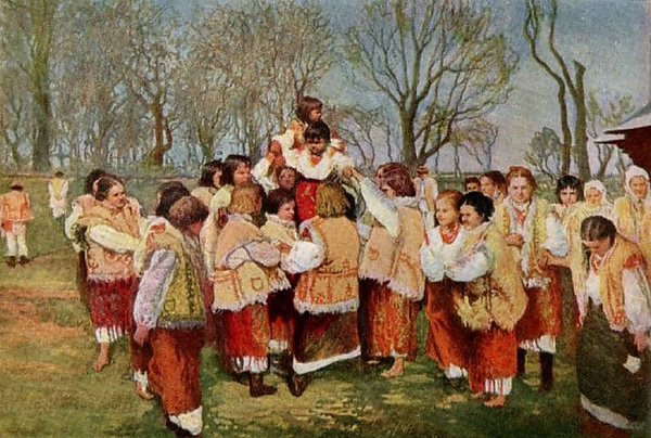 У украинцев Киевщины на Благовещение после обеда вокруг церкви девушки водят первый весенний хоровод: «Кривой танец» (укр. кривий танець). Взявшись за руки, девушки длинной чередой идут между тремя ивовыми колышками, воткнутыми в землю, и поют: