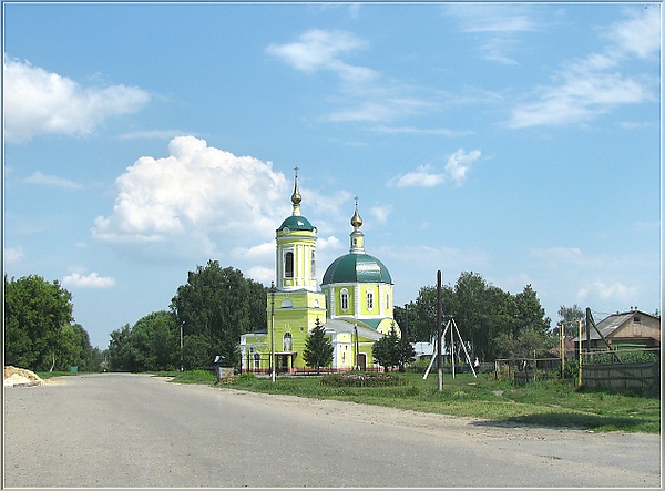 Вместо деревянной церкви, проданной в Петропавловскую пустынь, около 1805 г. жители села построили на собственные средства каменную церковь в честь Архистратига Божия Михаила с приделом в честь св. Николая, с каменною колокольнею, устроение придела в честь св. Тихона, епископа Задонского, и каменной ограды вокруг церкви относится к позднейшему времени. В 1871 г. стенною живописью была украшена настоящая церковь, а в 1882 г. — приделы[3][4].