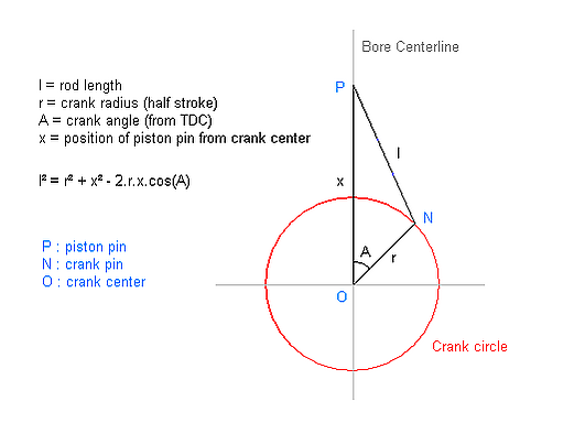 Как показано в диаграмме, центр кривошипа, кривошипношатунная ось и шатуннопоршневая ось образуют треугольник NOP.