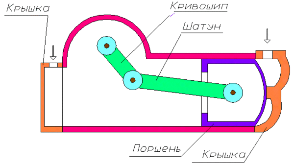 Обратная схема: Коленчатый вал под действием приложенного внешнего крутящего момента совершает вращательное движение, которое через кинематическую цепь «вал-шатун-поршень» преобразуется в поступательное движение поршня.