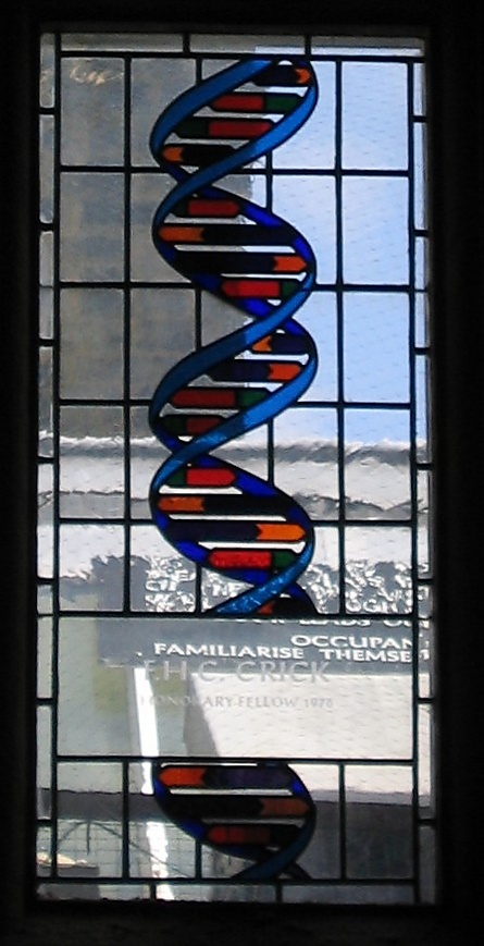 - Витраж с изображением спиральной структуры B-ДНК в честь Фрэнсиса Крика в столовой колледжа Гонвилла и Киза в Кембридже.