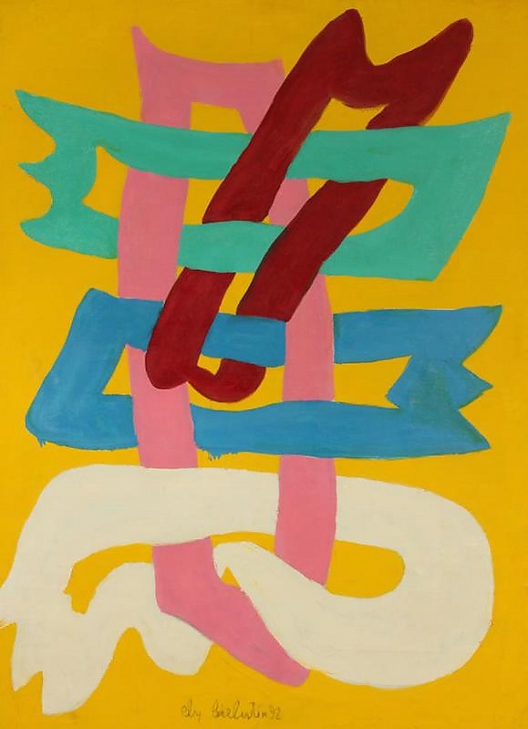 Работа выполнена в вертикальном формате и отличается полихромным колоритом с преобладанием ярких оттенков жёлтого, синего, зелёного, розового и белого. Композиция построена на цепном переплетении ярких полос, заканчивающихся зубчатыми выступами с одной стороны. Изображение размещено на насыщенном жёлтом фоне.